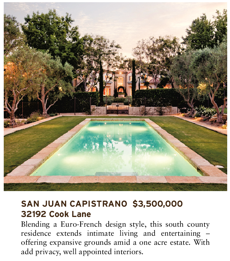 SAN JUAN CAPISTRANO $3,500,000 32192 Cook Lane Blending a Euro-French design style, this south county residence extends intimate living and entertaining – offering expansive grounds amid a one acre estate. With add privacy, well appointed interiors.