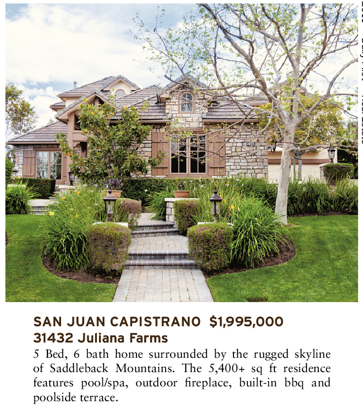 SAN JUAN CAPISTRANO $1,995,000 31432 Juliana Farms 5 Bed, 6 bath home surrounded by the rugged skyline of Saddleback Mountains. The 5,400+ sq ft residence features pool/spa, outdoor fireplace, built-in bbq and poolside terrace.