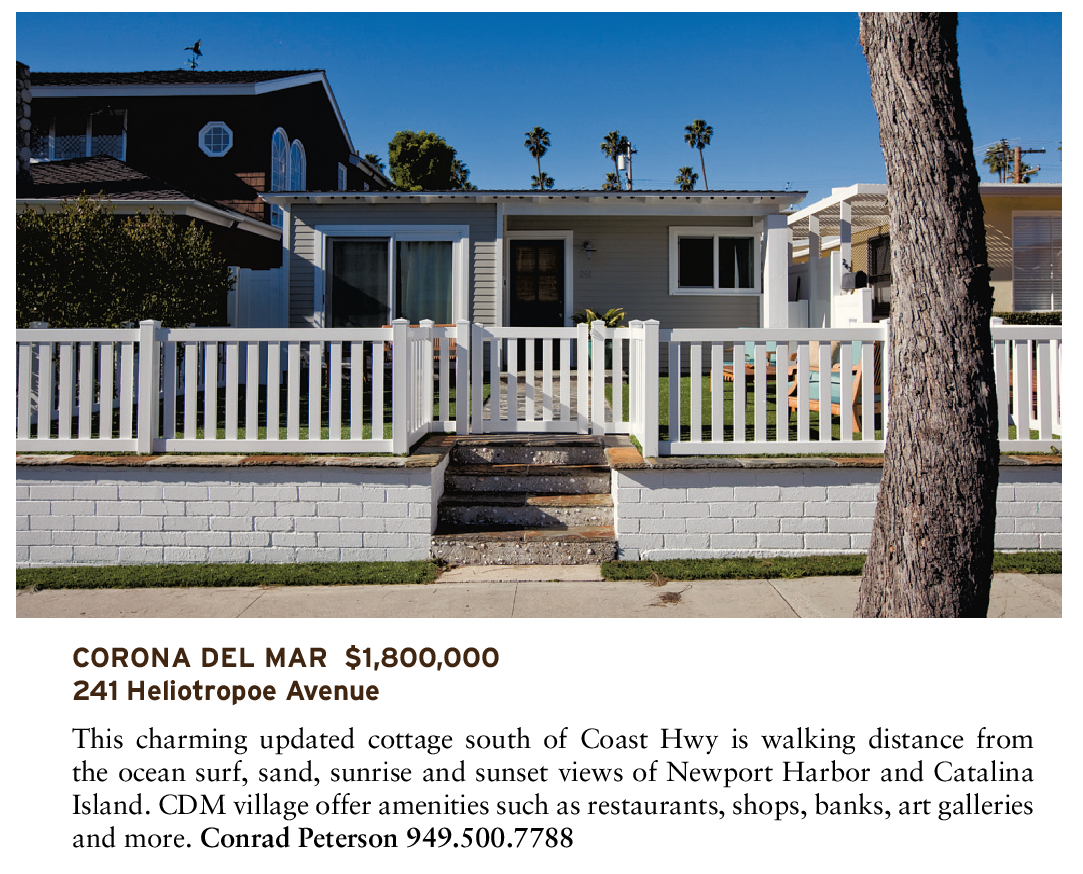 CORONA DEL MAR $1,800,000 241 Heliotropoe Avenue This charming updated cottage south of Coast Hwy is walking distance from the ocean surf, sand, sunrise and sunset views of Newport Harbor and Catalina Island. CDM village offer amenities such as restaurants, shops, banks, art galleries and more. Conrad Peterson 949.500.7788