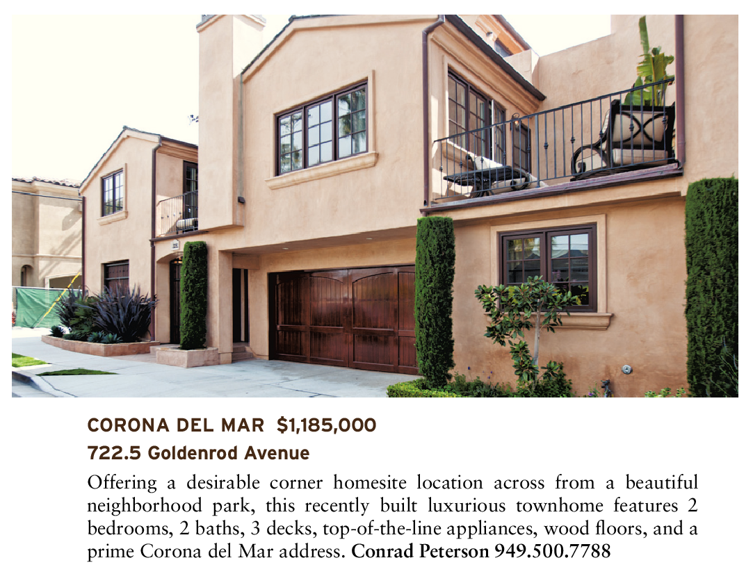 CORONA DEL MAR $1,185,000 722.5 Goldenrod Avenue Offering a desirable corner homesite location across from a beautiful neighborhood park, this recently built luxurious townhome features 2 bedrooms, 2 baths, 3 decks, top-of-the-line appliances, wood floors, and a prime Corona del Mar address. Conrad Peterson 949.500.7788