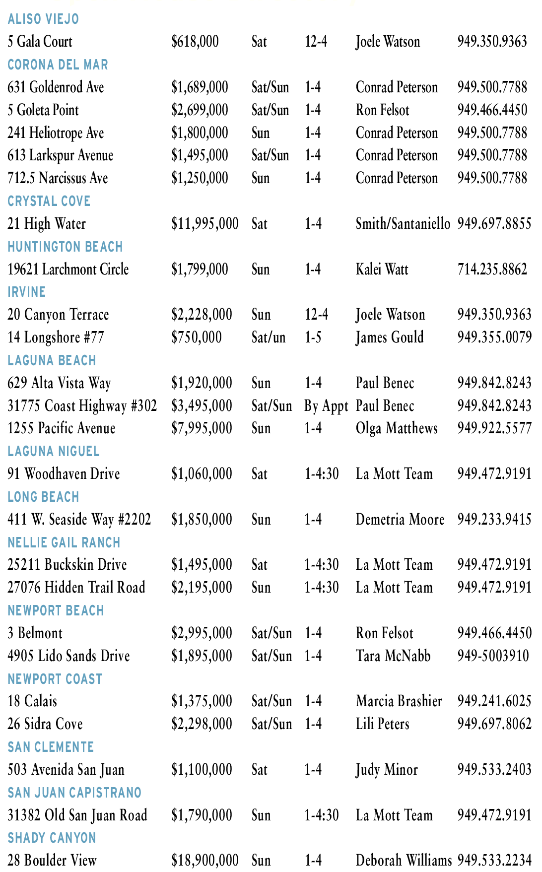 ALISO VIEJO 5 Gala Court $618,000 Sat 12-4 Joele Watson 949.350.9363 CORONA DEL MAR 631 Goldenrod Ave $1,689,000 Sat/Sun 1-4 Conrad Peterson 949.500.7788 5 Goleta Point $2,699,000 Sat/Sun 1-4 Ron Felsot 949.466.4450 241 Heliotrope Ave $1,800,000 Sun 1-4 Conrad Peterson 949.500.7788 613 Larkspur Avenue $1,495,000 Sat/Sun 1-4 Conrad Peterson 949.500.7788 712.5 Narcissus Ave $1,250,000 Sun 1-4 Conrad Peterson 949.500.7788 CRYSTAL COVE 21 High Water $11,995,000 Sat 1-4 Smith/Santaniello 949.697.8855 HUNTINGTON BEACH 19621 Larchmont Circle $1,799,000 Sun 1-4 Kalei Watt 714.235.8862 IRVINE 20 Canyon Terrace $2,228,000 Sun 12-4 Joele Watson 949.350.9363 14 Longshore #77 $750,000 Sat/un 1-5 James Gould 949.355.0079 LAGUNA BEACH 629 Alta Vista Way $1,920,000 Sun 1-4 Paul Benec 949.842.8243 31775 Coast Highway #302 $3,495,000 Sat/Sun By Appt Paul Benec 949.842.8243 1255 Pacific Avenue $7,995,000 Sun 1-4 Olga Matthews 949.922.5577 LAGUNA NIGUEL 91 Woodhaven Drive $1,060,000 Sat 1-4:30 La Mott Team 949.472.9191 LONG BEACH 411 W. Seaside Way #2202 $1,850,000 Sun 1-4 Demetria Moore 949.233.9415 NELLIE GAIL RANCH 25211 Buckskin Drive $1,495,000 Sat 1-4:30 La Mott Team 949.472.9191 27076 Hidden Trail Road $2,195,000 Sun 1-4:30 La Mott Team 949.472.9191 NEWPORT BEACH 3 Belmont $2,995,000 Sat/Sun 1-4 Ron Felsot 949.466.4450 4905 Lido Sands Drive $1,895,000 Sat/Sun 1-4 Tara McNabb 949-5003910 NEWPORT COAST 18 Calais $1,375,000 Sat/Sun 1-4 Marcia Brashier 949.241.6025 26 Sidra Cove $2,298,000 Sat/Sun 1-4 Lili Peters 949.697.8062 SAN CLEMENTE 503 Avenida San Juan $1,100,000 Sat 1-4 Judy Minor 949.533.2403 SAN JUAN CAPISTRANO 31382 Old San Juan Road $1,790,000 Sun 1-4:30 La Mott Team 949.472.9191 SHADY CANYON 28 Boulder View $18,900,000 Sun 1-4 Deborah Williams 949.533.2234