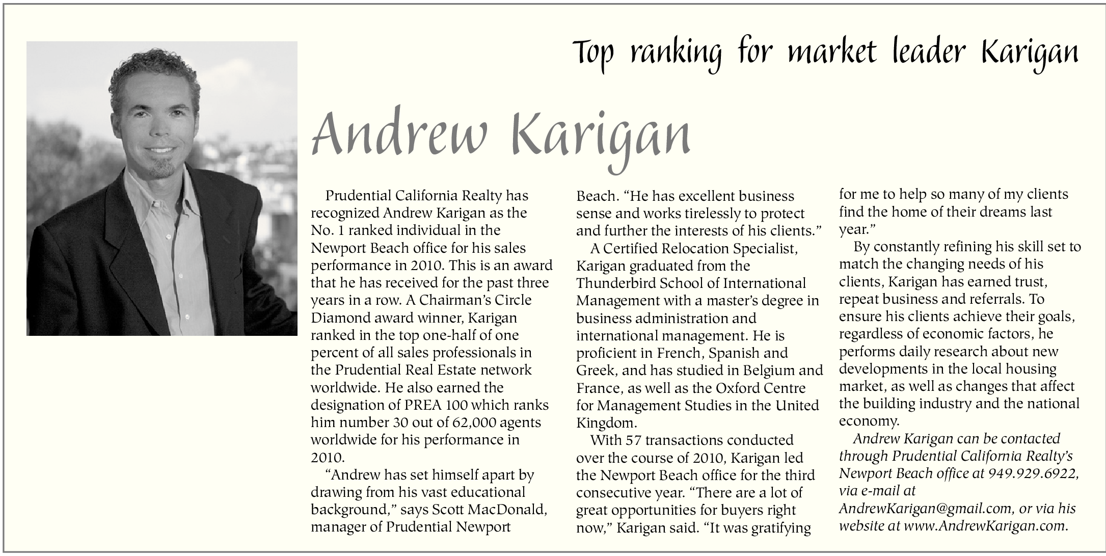 Prudential California Realty has recognized Andrew Karigan as the No. 1 ranked individual in the Newport Beach office for his sales performance in 2010. This is an award that he has received for the past three years in a row. A Chairman’s Circle Diamond award winner, Karigan ranked in the top one-half of one percent of all sales professionals in the Prudential Real Estate network worldwide. He also earned the designation of PREA 100 which ranks him number 30 out of 62,000 agents worldwide for his performance in 2010.