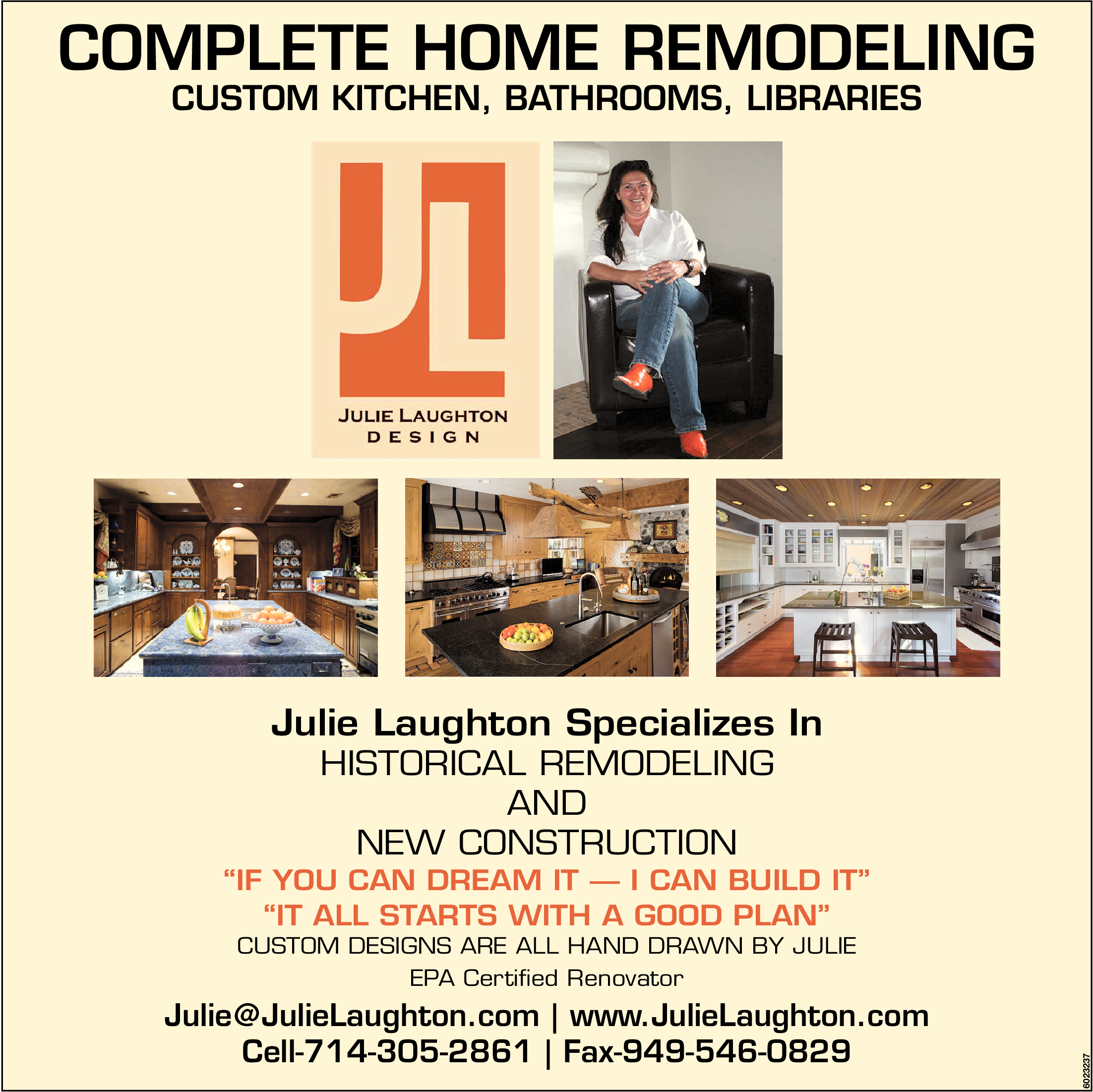 COMPLETE HOME REMODELING CUSTOM KITCHEN, BATHROOMS, LIBRARIES Julie Laughton Specializes In HISTORICAL REMODELING AND NEW CONSTRUCTION “IF YOU CAN DREAM IT — I CAN BUILD IT” “IT ALL STARTS WITH A GOOD PLAN” CUSTOM DESIGNS ARE ALL HAND DRAWN BY JULIE EPA Certified Renovator Julie@JulieLaughton.com | www.JulieLaughton.com Cell-714-305-2861 | Fax-949-546-0829