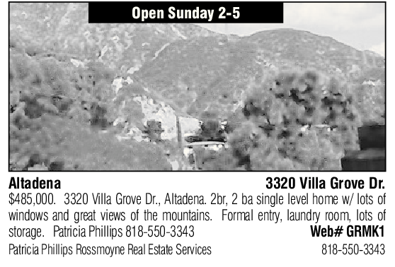 Altadena 3320 Villa Grove Dr. $485,000. 3320 Villa Grove Dr., Altadena. 2br, 2 ba single level home w/ lots of windows and great views of the mountains. Formal entry, laundry room, lots of storage. Patricia Phillips 818-550-3343 Web# GRMK1 Patricia Phillips Rossmoyne Real Estate Services 818-550-3343