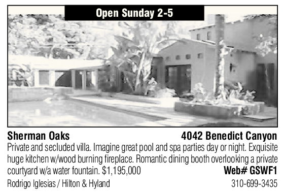 Sherman Oaks 4042 Benedict Canyon Private and secluded villa. Imagine great pool and spa parties day or night. Exquisite huge kitchen w/wood burning fireplace. Romantic dining booth overlooking a private courtyard w/a water fountain. $1,195,000 Web# GSWF1 Rodrigo Iglesias / Hilton & Hyland 310-699-3435