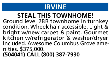 IRVINE STEAL THIS TOWNHOME! Ground level 2BR townhome in turnkey condition. Wheelchair accessible. Light & bright w/new carpet & paint. Gourmet kitchen w/refrigerator & washer/dryer included. Awesome Columbus Grove amenities. $375,000. (504041) CALL (800) 387-7930