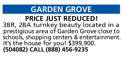 3BR, 2BA turnkey beauty located in a prestigious area of Garden Grove close to schools, shopping centers & entertainment. It’s the house for you! $399,900. (504082) CALL (888) 456-9235