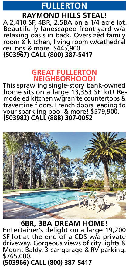 FULLERTON RAYMOND HILLS STEAL! A 2,410 SF, 4BR, 2.5BA on a 1/4 acre lot. Beautifully landscaped front yard w/a relaxing oasis in back. Oversized family room & kitchen, living room w/cathedral ceilings & more. $445,900. (503967) CALL (800) 387-5417 GREAT FULLERTON NEIGHBORHOOD! This sprawling single-story bank-owned home sits on a large 13,353 SF lot! Remodeled kitchen w/granite countertops & travertine floors. French doors leading to your sparkling pool & more! $579,900. (503982) CALL (888) 307-0052 6BR, 3BA DREAM HOME! Entertainer’s delight on a large 19,200 SF lot at the end of a CDS w/a private driveway. Gorgeous views of city lights & Mount Baldy. 3-car garage & RV parking. $765,000. (503966) CALL (800) 387-5417