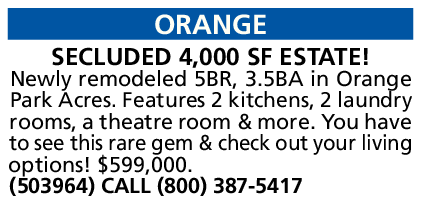 Newly remodeled 5BR, 3.5BA in Orange Park Acres. Features 2 kitchens, 2 laundry rooms, a theatre room & more. You have to see this rare gem & check out your living options! $599,000. (503964) CALL (800) 387-5417