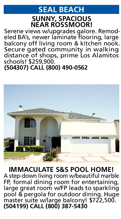 SEAL BEACH SUNNY, SPACIOUS NEAR ROSSMOOR! Serene views w/upgrades galore. Remodeled BA’s, newer laminate flooring, large balcony off living room & kitchen nook. Secure gated community in walking distance of shops, prime Los Alamitos schools! $259,900. (504307) CALL (800) 490-0562 IMMACULATE S&S POOL HOME! A step-down living room w/beautiful marble FP, formal dining room for entertaining, large great room w/FP leads to sparkling pool & pergola for outdoor dining. Huge master suite w/large balcony! $722,500. (504199) CALL (800) 387-5430