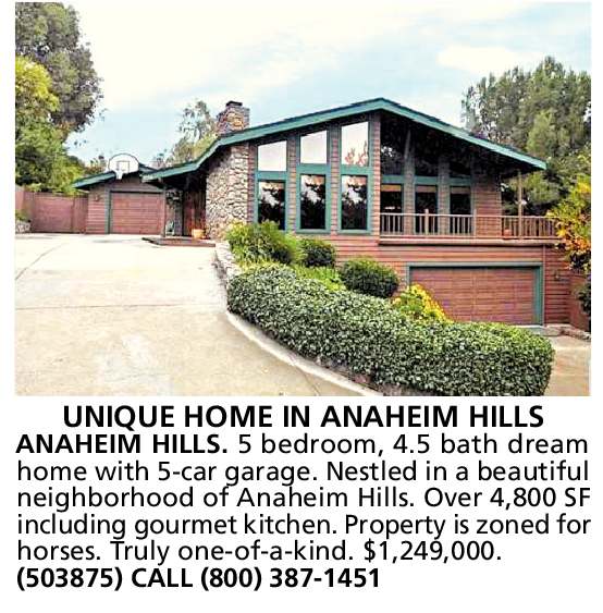 UNIQUE HOME IN ANAHEIM HILLS ANAHEIM HILLS. 5 bedroom, 4.5 bath dream home with 5-car garage. Nestled in a beautiful neighborhood of Anaheim Hills. Over 4,800 SF including gourmet kitchen. Property is zoned for horses. Truly one-of-a-kind. $1,249,000. (503875) CALL (800) 387-1451