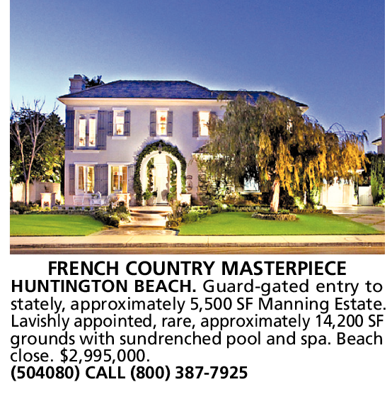 FRENCH COUNTRY MASTERPIECE HUNTINGTON BEACH. Guard-gated entry to stately, approximately 5,500 SF Manning Estate. Lavishly appointed, rare, approximately 14,200 SF grounds with sundrenched pool and spa. Beach close. $2,995,000. (504080) CALL (800) 387-7925