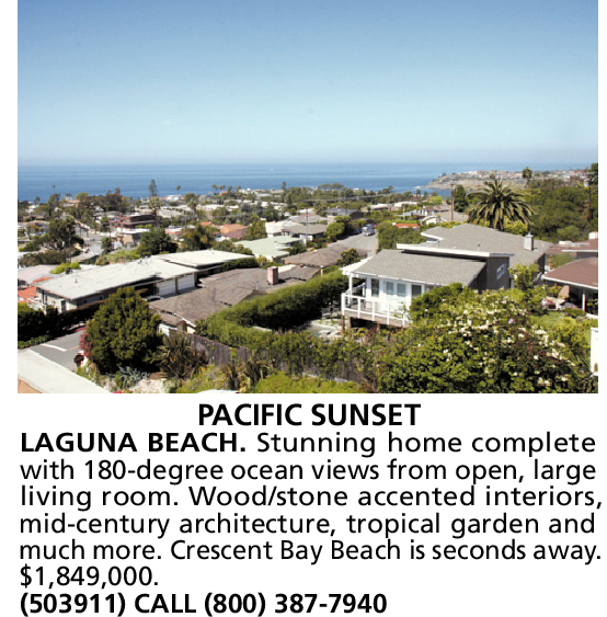 Estate. PACIFIC SUNSET LAGUNA BEACH. Stunning home complete with 180-degree ocean views from open, large living room. Wood/stone accented interiors, mid-century architecture, tropical garden and much more. Crescent Bay Beach is seconds away. $1,849,000. (503911) CALL (800) 387-7940