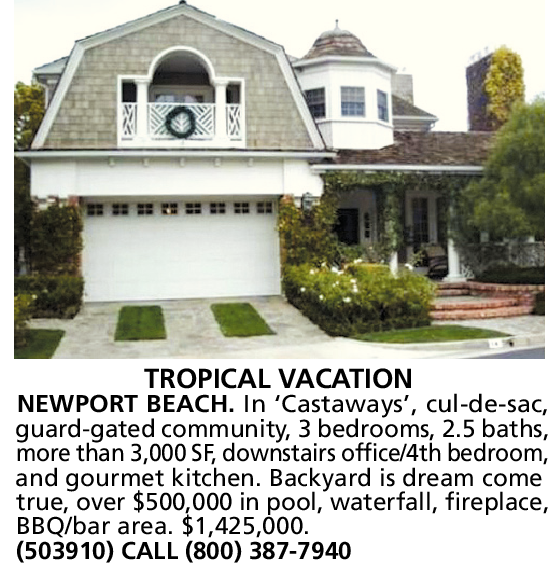 interiors, away. TROPICAL VACATION NEWPORT BEACH. In ‘Castaways’, cul-de-sac, guard-gated community, 3 bedrooms, 2.5 baths, more than 3,000 SF, downstairs office/4th bedroom, and gourmet kitchen. Backyard is dream come true, over $500,000 in pool, waterfall, fireplace, BBQ/bar area. $1,425,000. (503910) CALL (800) 387-7940