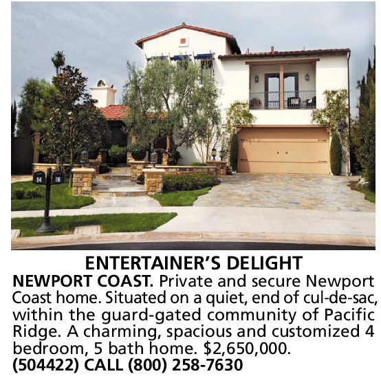 ENTERTAINER’S DELIGHT NEWPORT COAST. Private and secure Newport Coast home. Situated on a quiet, end of cul-de-sac, within the guard-gated community of Pacific Ridge. A charming, spacious and customized 4 bedroom, 5 bath home. $2,650,000. (504422) CALL (800) 258-7630