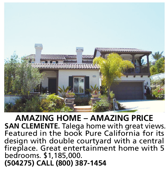 AMAZING HOME – AMAZING PRICE SAN CLEMENTE. Talega home with great views. Featured in the book Pure California for its design with double courtyard with a central fireplace. Great entertainment home with 5 bedrooms. $1,185,000. (504275) CALL (800) 387-1454