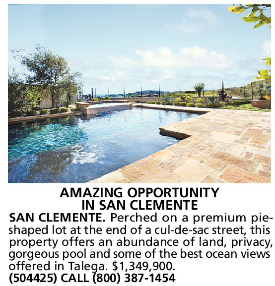 views. AMAZING OPPORTUNITY IN SAN CLEMENTE SAN CLEMENTE. Perched on a premium pieshaped lot at the end of a cul-de-sac street, this property offers an abundance of land, privacy, gorgeous pool and some of the best ocean views offered in Talega. $1,349,900. (504425) CALL (800) 387-1454