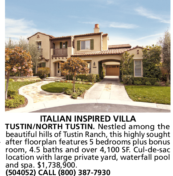 Vineyard, ITALIAN INSPIRED VILLA TUSTIN/NORTH TUSTIN. Nestled among the beautiful hills of Tustin Ranch, this highly sought after floorplan features 5 bedrooms plus bonus room, 4.5 baths and over 4,100 SF. Cul-de-sac location with large private yard, waterfall pool and spa. $1,738,900. (504052) CALL (800) 387-7930