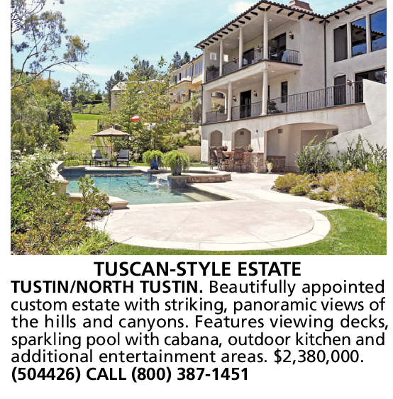 TUSCAN-STYLE ESTATE TUSTIN/NORTH TUSTIN. Beautifully appointed custom estate with striking, panoramic views of the hills and canyons. Features viewing decks, sparkling pool with cabana, outdoor kitchen and additional entertainment areas. $2,380,000. (504426) CALL (800) 387-1451