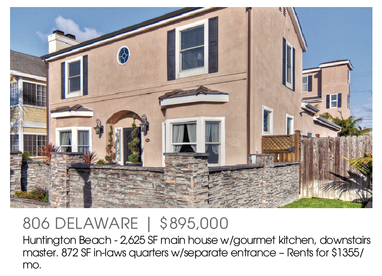 806 DELAWARE | $895,000 Huntington Beach - 2,625 SF main house w/gourmet kitchen, downstairs master. 872 SF in-laws quarters w/separate entrance – Rents for $1355/ mo.