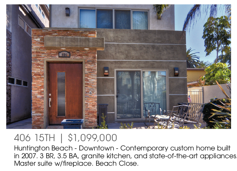 406 15TH | $1,099,000 Huntington Beach - Downtown - Contemporary custom home built in 2007. 3 BR, 3.5 BA, granite kitchen, and state-of-the-art appliances. Master suite w/fireplace. Beach Close.