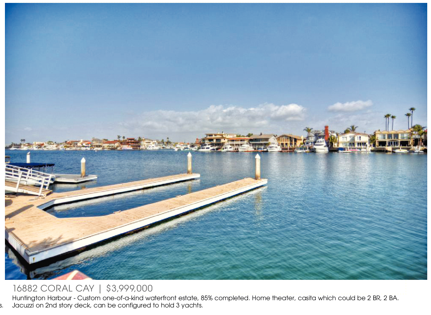 16882 CORAL CAY | $3,999,000 Huntington Harbour - Custom one-of-a-kind waterfront estate, 85% completed. Home theater, casita which could be 2 BR, 2 BA. Jacuzzi on 2nd story deck, can be configured to hold 3 yachts.