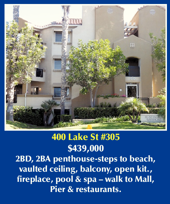400 Lake St #305 $439,000 2BD, 2BA penthouse-steps to beach, vaulted ceiling, balcony, open kit., fireplace, pool & spa – walk to Mall, Pier & restaurants.