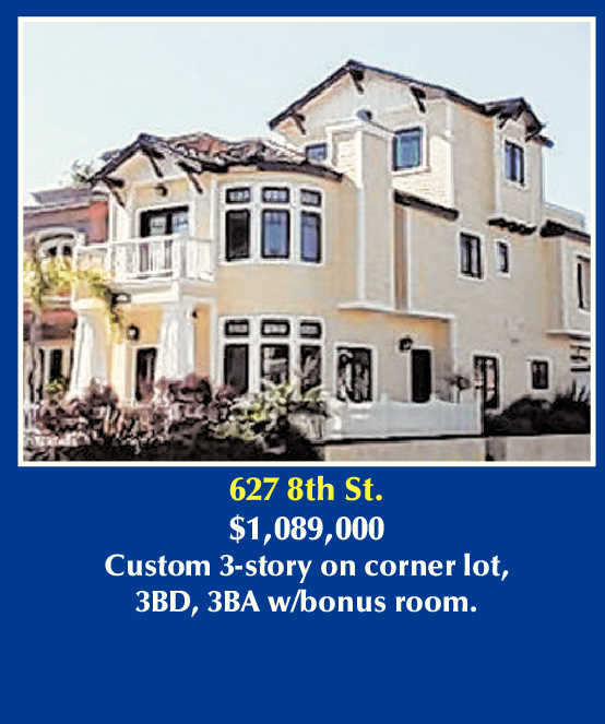 627 8th St. $1,089,000 Custom 3-story on corner lot, 3BD, 3BA w/bonus room.