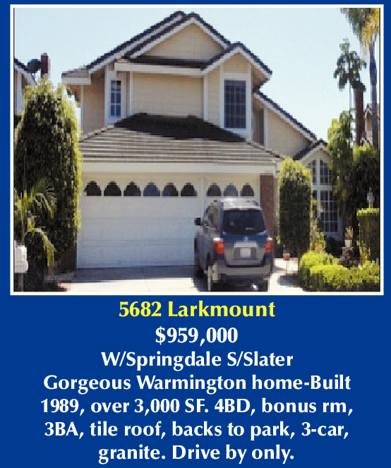 5682 Larkmount $959,000 W/Springdale S/Slater Gorgeous Warmington home-Built 1989, over 3,000 SF. 4BD, bonus rm, 3BA, tile roof, backs to park, 3-car, granite. Drive by only.