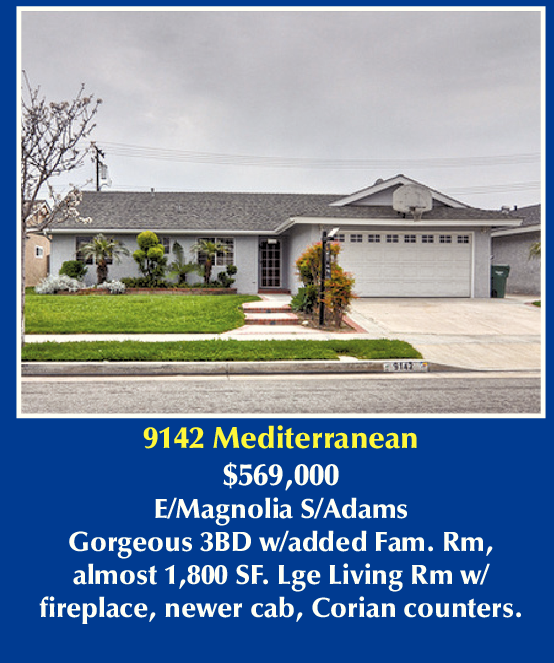 9142 Mediterranean $569,000 E/Magnolia S/Adams Gorgeous 3BD w/added Fam. Rm, almost 1,800 SF. Lge Living Rm w/ fireplace, newer cab, Corian counters.