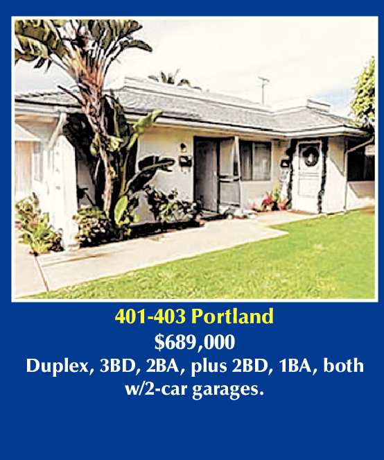 401-403 Portland $689,000 Duplex, 3BD, 2BA, plus 2BD, 1BA, both w/2-car garages.