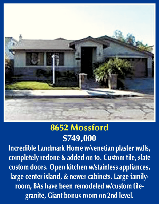 8652 Mossford $749,000 Incredible Landmark Home w/venetian plaster walls, completely redone & added on to. Custom tile, slate custom doors. Open kitchen w/stainless appliances, large center island, & newer cabinets. Large familyroom, BAs have been remodeled w/custom tilegranite, Giant bonus room on 2nd level.