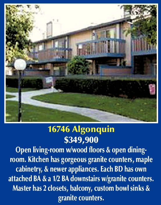 16746 Algonquin $349,900 Open living-room w/wood floors & open diningroom. Kitchen has gorgeous granite counters, maple cabinetry, & newer appliances. Each BD has own attached BA & a 1/2 BA downstairs w/granite counters. Master has 2 closets, balcony, custom bowl sinks & granite counters.