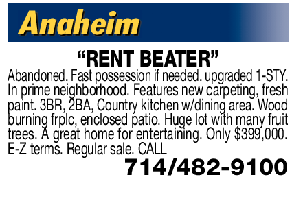 Anaheim “RENT BEATER” Abandoned. Fast possession if needed. upgraded 1-STY. In prime neighborhood. Features new carpeting, fresh paint. 3BR, 2BA, Country kitchen w/dining area. Wood burning frplc, enclosed patio. Huge lot with many fruit trees. A great home for entertaining. Only $399,000. E-Z terms. Regular sale. CALL 714/482-9100