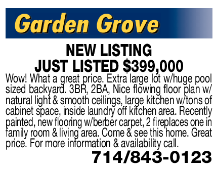 Garden Grove NEW LISTING JUST LISTED $399,000 Wow! What a great price. Extra large lot w/huge pool sized backyard. 3BR, 2BA, Nice flowing floor plan w/ natural light & smooth ceilings, large kitchen w/tons of cabinet space, inside laundry off kitchen area. Recently painted, new flooring w/berber carpet, 2 fireplaces one in family room & living area. Come & see this home. Great price. For more information & availability call. 714/843-0123