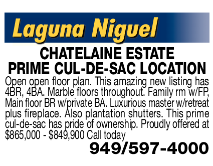 CHATELAINE ESTATE PRIME CUL-DE-SAC LOCATION Open open floor plan. This amazing new listing has 4BR, 4BA. Marble floors throughout. Family rm w/FP, Main floor BR w/private BA. Luxurious master w/retreat plus fireplace. Also plantation shutters. This prime cul-de-sac has pride of ownership. Proudly offered at $865,000 - $849,900 Call today 949/597-4000