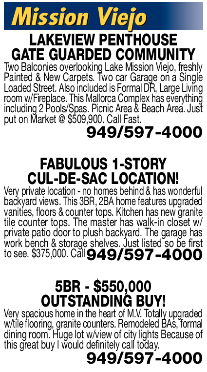 Mission Viejo LAKEVIEW PENTHOUSE GATE GUARDED COMMUNITY Two Balconies overlooking Lake Mission Viejo, freshly Painted & New Carpets. Two car Garage on a Single Loaded Street. Also included is Formal DR, Large Living room w/Fireplace. This Mallorca Complex has everything including 2 Pools/Spas. Picnic Area & Beach Area. Just put on Market @ $509,900. Call Fast. 949/597-4000 FABULOUS 1-STORY CUL-DE-SAC LOCATION! Very private location - no homes behind & has wonderful backyard views. This 3BR, 2BA home features upgraded vanities, floors & counter tops. Kitchen has new granite tile counter tops. The master has walk-in closet w/ private patio door to plush backyard. The garage has work bench & storage shelves. Just listed so be first to see. $375,000. Call949/597-4000 5BR - $550,000 OUTSTANDING BUY! Very spacious home in the heart of M.V. Totally upgraded w/tile flooring, granite counters. Remodeled BAs, formal dining room. Huge lot w/view of city lights Because of this great buy I would definitely call today. 949/597-4000
