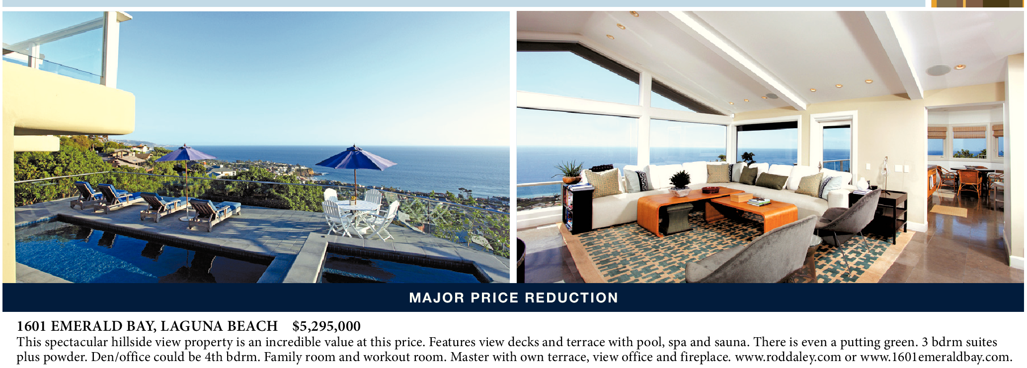 1601 EMERALD BAY, LAGUNA BEACH $5,295,000 This spectacular hillside view property is an incredible value at this price. Features view decks and terrace with pool, spa and sauna. There is even a putting green. 3 bdrm suites plus powder. Den/office could be 4th bdrm. Family room and workout room. Master with own terrace, view office and fireplace. www.roddaley.com or www.1601emeraldbay.com.