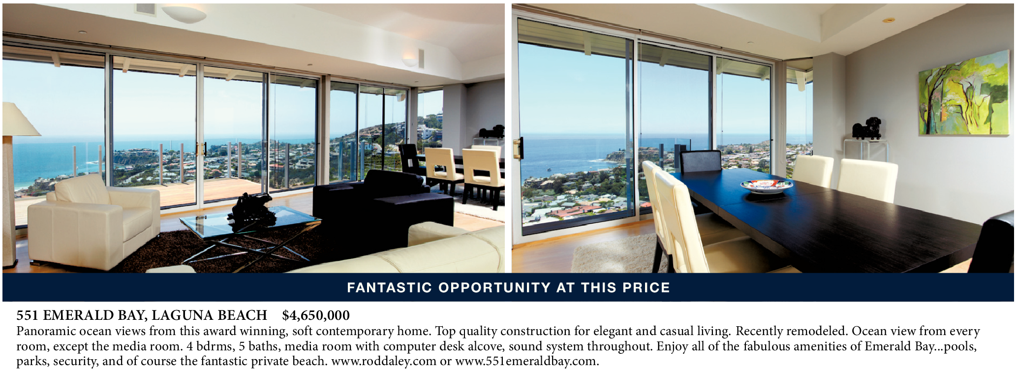 551 EMERALD BAY, LAGUNA BEACH $4,650,000 Panoramic ocean views from this award winning, soft contemporary home. Top quality construction for elegant and casual living. Recently remodeled. Ocean view from every room, except the media room. 4 bdrms, 5 baths, media room with computer desk alcove, sound system throughout. Enjoy all of the fabulous amenities of Emerald Bay...pools, parks, security, and of course the fantastic private beach. www.roddaley.com or www.551emeraldbay.com.