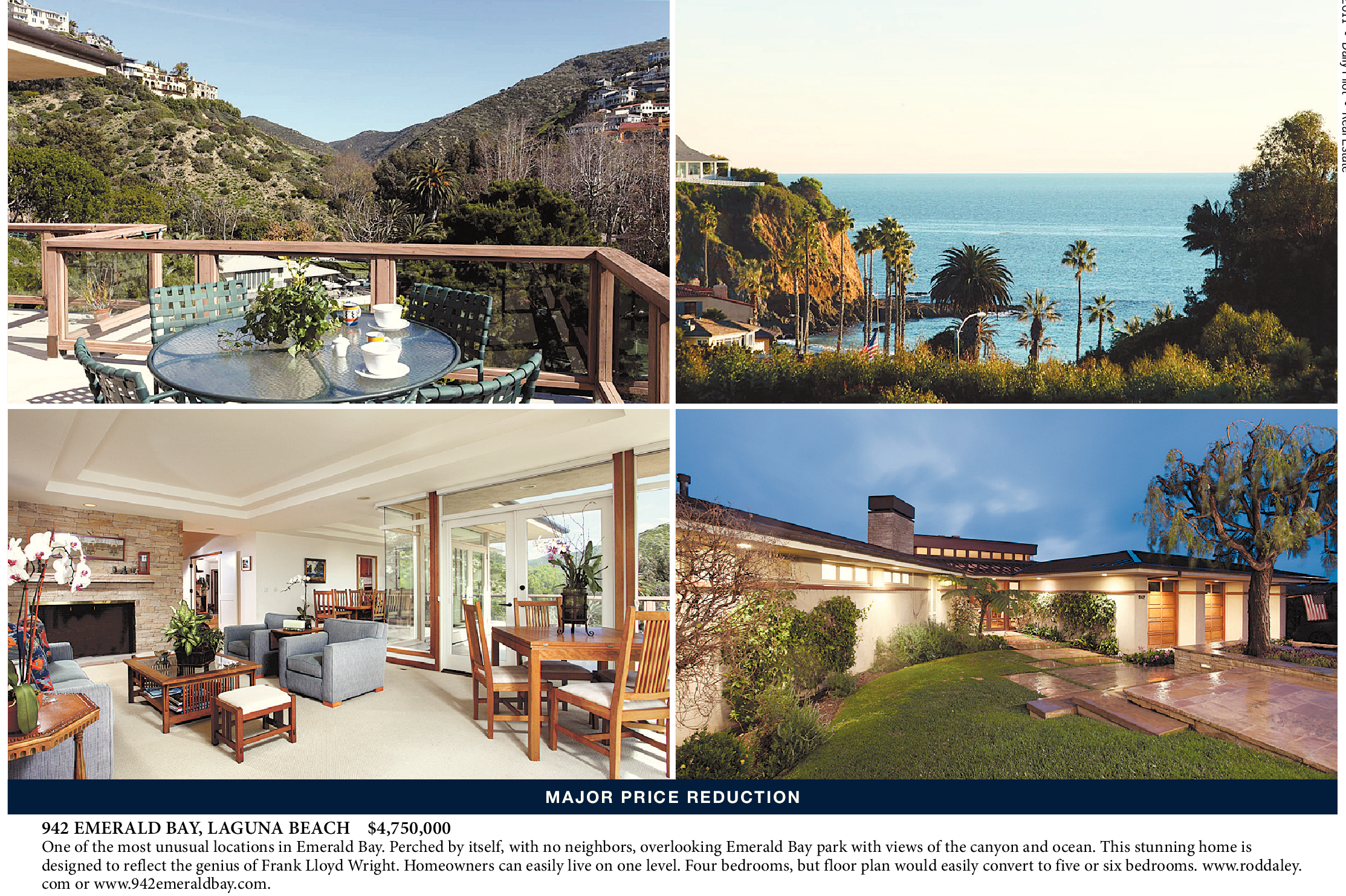 942 EMERALD BAY, LAGUNA BEACH $4,750,000 One of the most unusual locations in Emerald Bay. Perched by itself, with no neighbors, overlooking Emerald Bay park with views of the canyon and ocean. This stunning home is designed to reflect the genius of Frank Lloyd Wright. Homeowners can easily live on one level. Four bedrooms, but floor plan would easily convert to five or six bedrooms. www.roddaley. com or www.942emeraldbay.com.