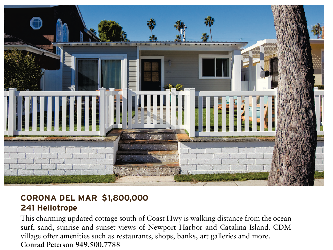 CORONA DEL MAR $1,800,000 241 Heliotrope This charming updated cottage south of Coast Hwy is walking distance from the ocean surf, sand, sunrise and sunset views of Newport Harbor and Catalina Island. CDM village offer amenities such as restaurants, shops, banks, art galleries and more. Conrad Peterson 949.500.7788
