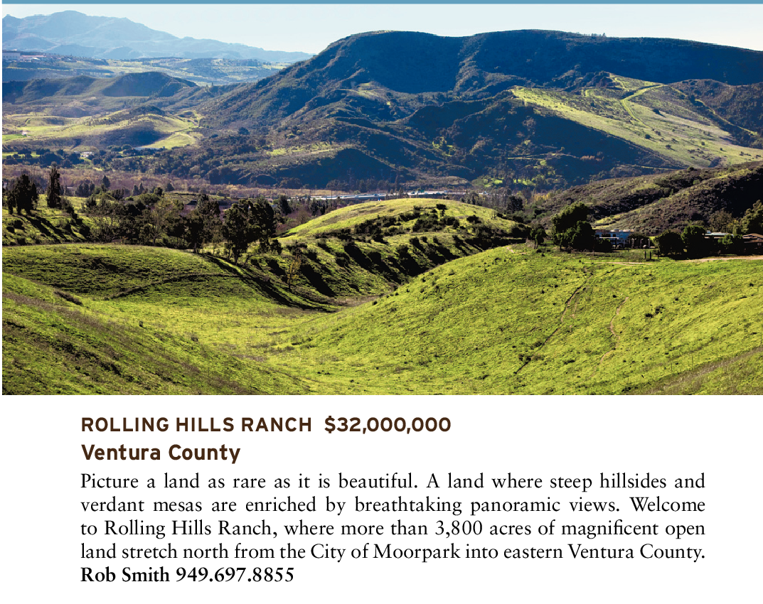 ROLLING HILLS RANCH $32,000,000 Ventura County Picture a land as rare as it is beautiful. A land where steep hillsides and verdant mesas are enriched by breathtaking panoramic views. Welcome to Rolling Hills Ranch, where more than 3,800 acres of magnificent open land stretch north from the City of Moorpark into eastern Ventura County. Rob Smith 949.697.8855