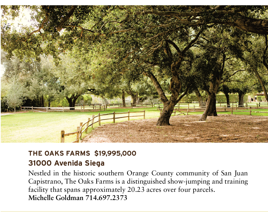 THE OAKS FARMS $19,995,000 31000 Avenida Siega Nestled in the historic southern Orange County community of San Juan Capistrano, The Oaks Farms is a distinguished show-jumping and training facility that spans approximately 20.23 acres over four parcels. Michelle Goldman 714.697.2373