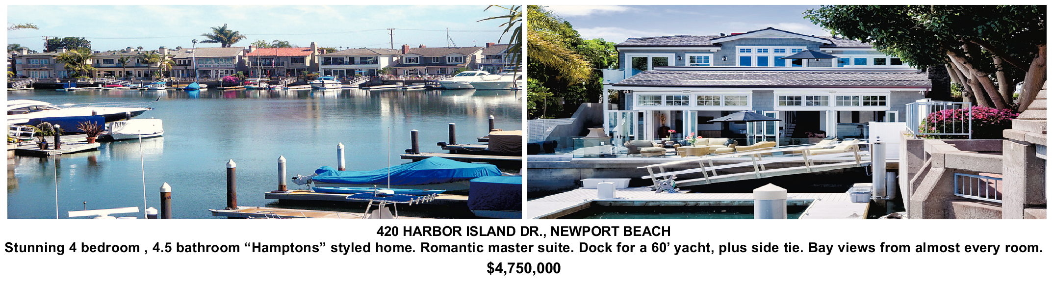 420 HARBOR ISLAND DR., NEWPORT BEACH Stunning 4 bedroom , 4.5 bathroom “Hamptons” styled home. Romantic master suite. Dock for a 60’ yacht, plus side tie. Bay views from almost every room.