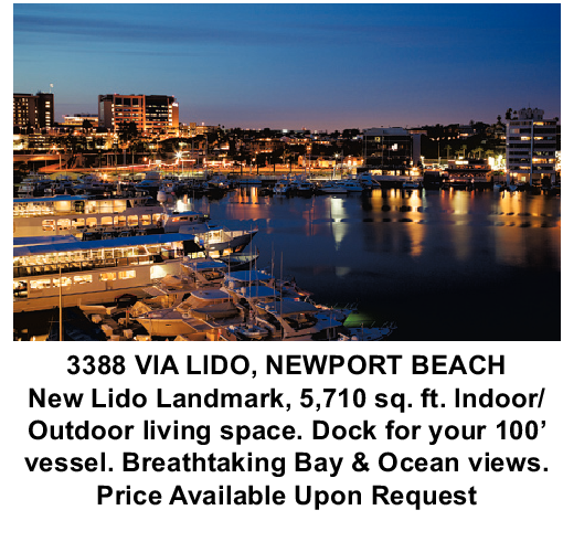3388 VIA LIDO, NEWPORT BEACH New Lido Landmark, 5,710 sq. ft. Indoor/ Outdoor living space. Dock for your 100’ vessel. Breathtaking Bay & Ocean views.