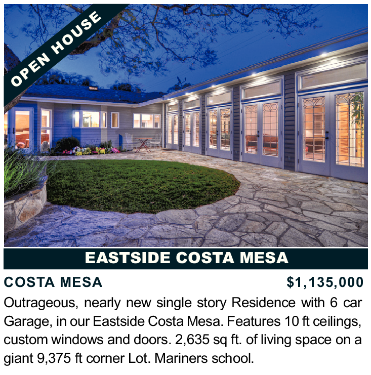 EASTSIDE COSTA MESA COSTA MESA $1,135,000 Outrageous, nearly new single story Residence with 6 car Garage, in our Eastside Costa Mesa. Features 10 ft ceilings, custom windows and doors. 2,635 sq ft. of living space on a giant 9,375 ft corner Lot. Mariners school.