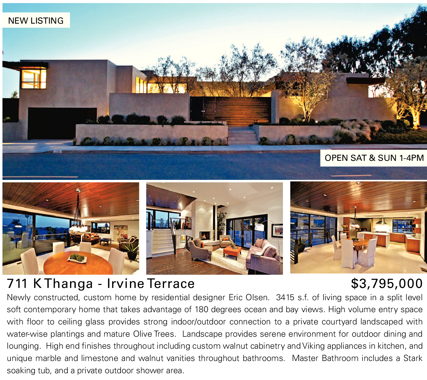 NEW LISTING OPEN SAT & SUN 1-4PM 711 K Thanga - Irvine Terrace $3,795,000 Newly constructed, custom home by residential designer Eric Olsen. 3415 s.f. of living space in a split level soft contemporary home that takes advantage of 180 degrees ocean and bay views. High volume entry space with floor to ceiling glass provides strong indoor/outdoor connection to a private courtyard landscaped with water-wise plantings and mature Olive Trees. Landscape provides serene environment for outdoor dining and lounging. High end finishes throughout including custom walnut cabinetry and Viking appliances in kitchen, and unique marble and limestone and walnut vanities throughout bathrooms. Master Bathroom includes a Stark soaking tub, and a private outdoor shower area.