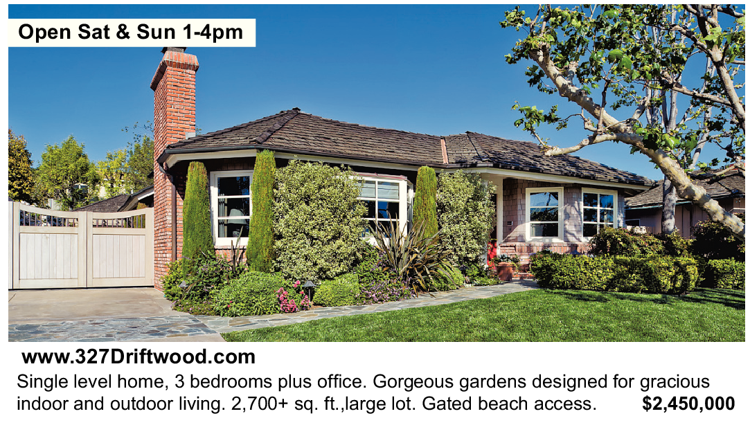 www.327Driftwood.com Single level home, 3 bedrooms plus office. Gorgeous gardens designed for gracious indoor and outdoor living. 2,700+ sq. ft.,large lot. Gated beach access. $2,450,000