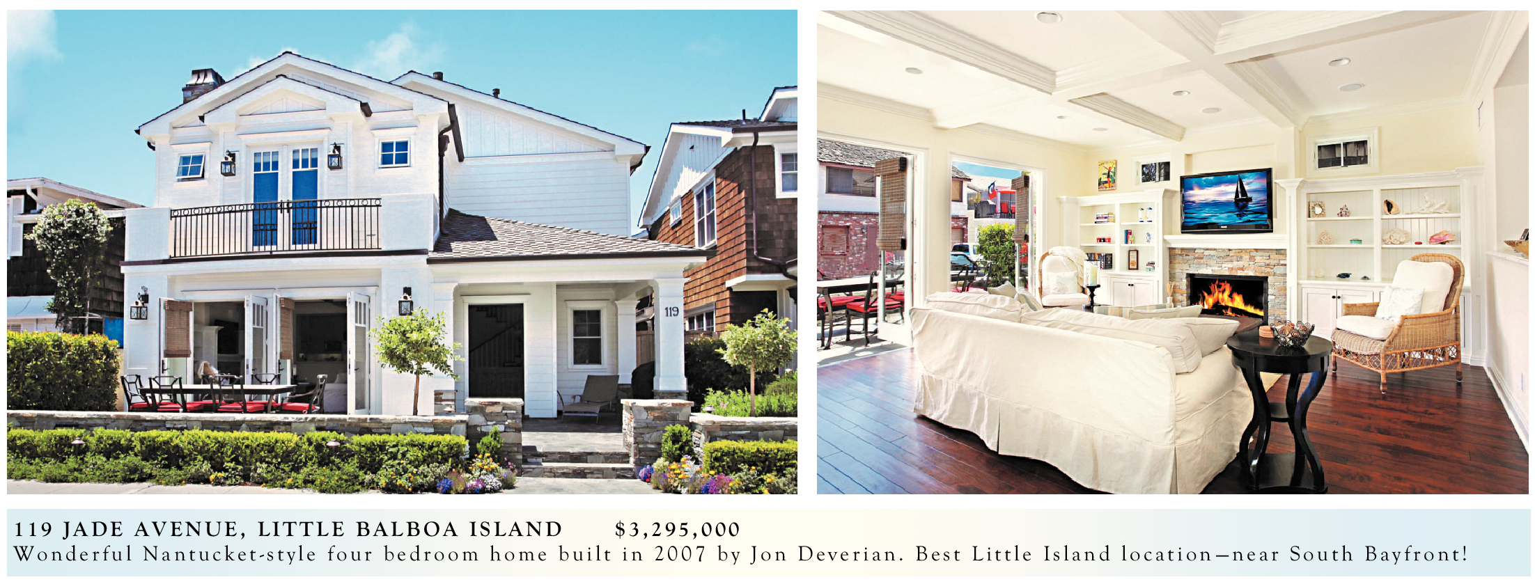 119 JADE AVENUE, LITTLE BALBOA ISLAND $3,295,000 Wonderful Nantucket-style four bedroom home built in 2007 by Jon Deverian. Best Little Island location — near South Bayfront!