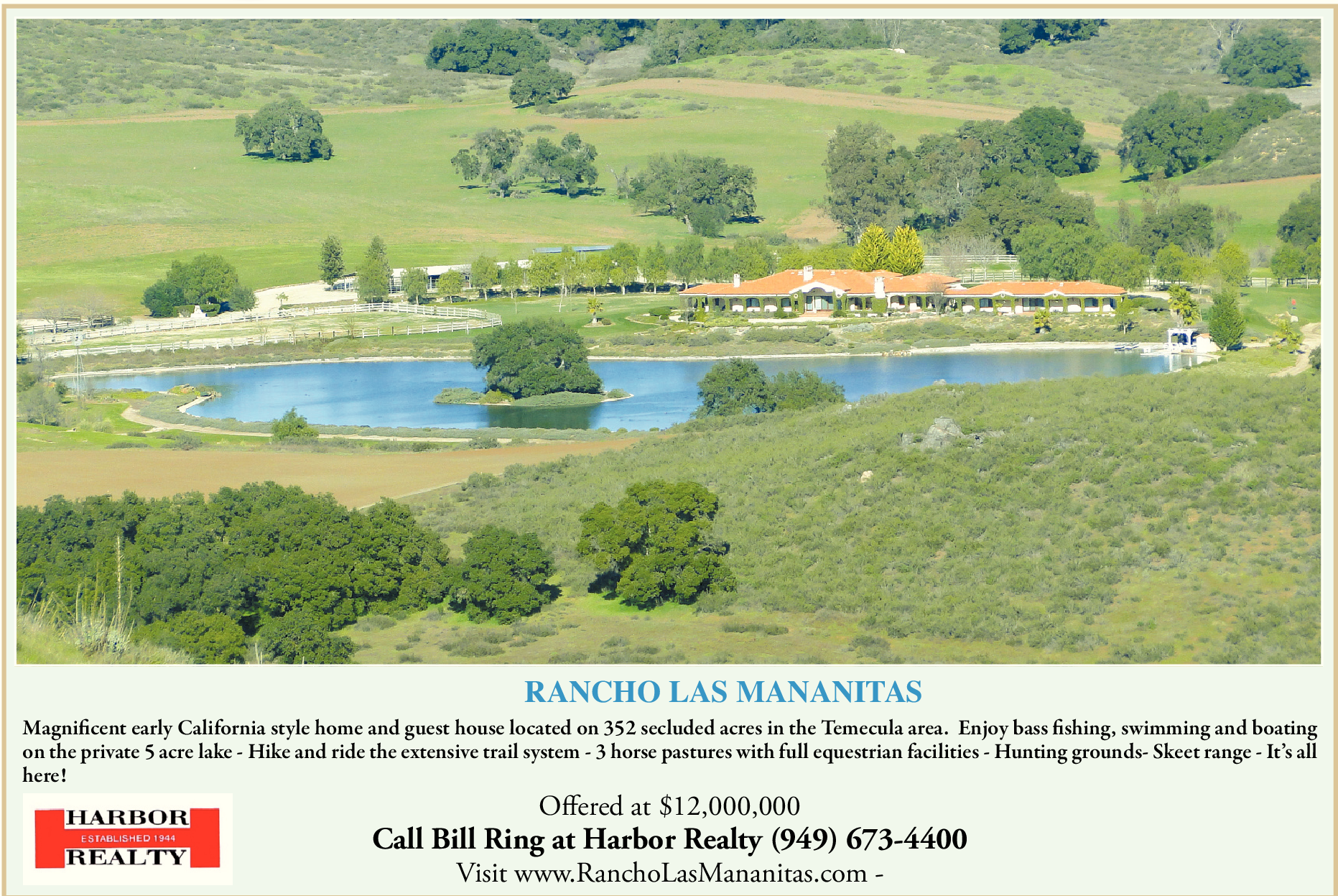 RANCHO LAS MANANITAS Magnificent early California style home and guest house located on 352 secluded acres in the Temecula area. Enjoy bass fishing, swimming and boating on the private 5 acre lake - Hike and ride the extensive trail system - 3 horse pastures with full equestrian facilities - Hunting grounds- Skeet range - It’s all here! Offered at $12,000,000 Call Bill Ring at Harbor Realty (949) 673-4400 Visit www.RanchoLasMananitas.com -